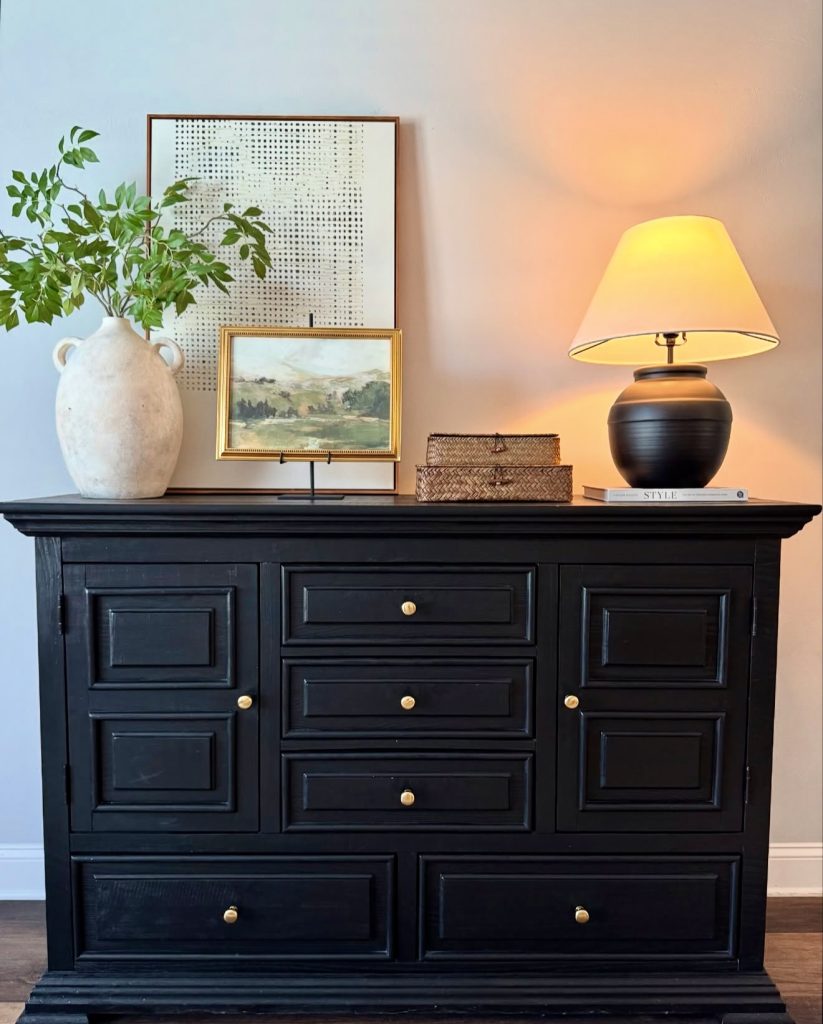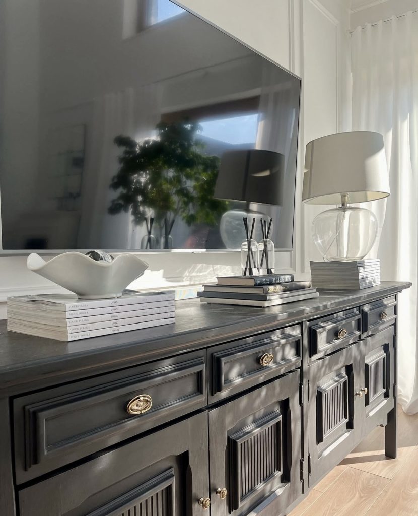 8. Dramatic Black Dresser Beneath a Mounted TV