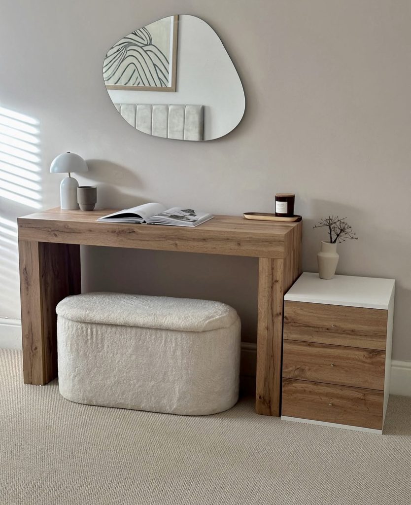 6. Minimalist Setup with Organic Mirror and Neutral Tones