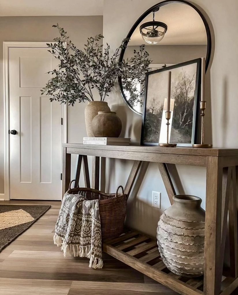 This rustic entryway embraces the essence of quiet simplicity. A sturdy wood console anchors the space, layered with antique pottery and dried greenery that evoke a sense of primitive beauty. The large round mirror reflects soft light, while a woven basket and textured throw lend warmth and tactility. It’s the perfect example of how country style can feel classy without being fussy—refined yet approachable. For 2026, decorators are leaning into neutral tones with natural accents, proving that simple details often make the most powerful impression.