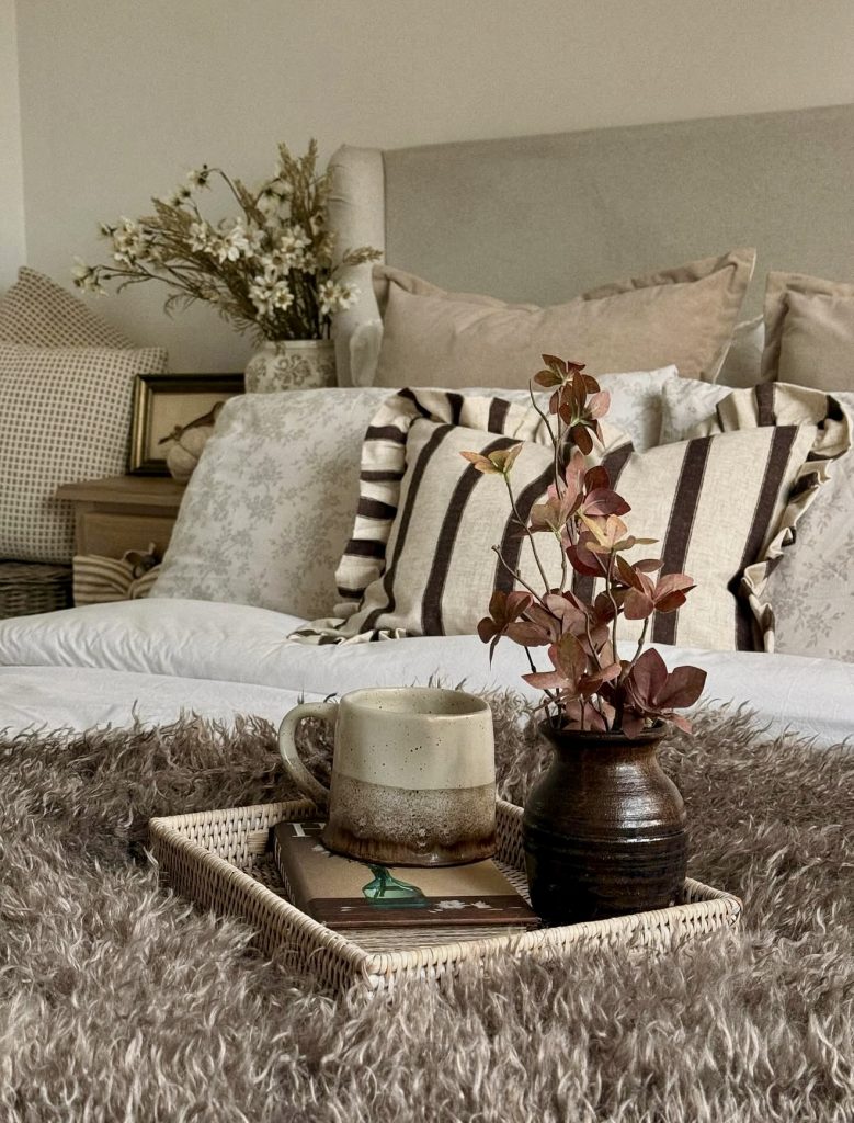 This bedroom radiates moody tranquility. The combination of linen, wool, and ceramic reflects a balance between primitive simplicity and modern sensibility. The layered pillows and fur-like blanket invite relaxation, while the small tray with a mug and vase adds a boho note of authenticity. The earthy color scheme—taupe, chocolate, and cream—feels both eclectic and grounded, proving that farmhouse decor doesn’t always need to be bright. In 2026, darker, Western-inspired neutrals are making a comeback, giving bedrooms a cocoon-like comfort that’s beautifully timeless.