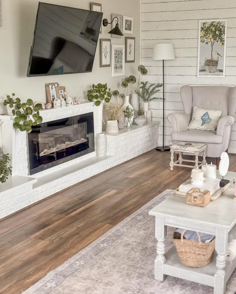 This soft, light-filled living room embodies the spirit of modern farmhouse living—calm, bright, and beautifully balanced. The white-painted brick fireplace, cottage-style vases, and layered greenery create a fresh, organic feel. A touch of coastal charm comes through in the botanical artwork and sea-inspired pillow, while the mix of vintage frames adds a country elegance. What makes this space timeless is its comfort-first approach: a serene neutral palette, simple decor, and a perfect blend of textures that feel as warm as they look.