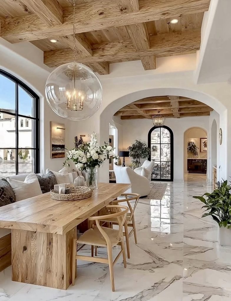 This expansive dining space blends Italian sophistication with farmhouse character. The natural wood table and coffered ceiling bring warmth to the sleek marble floors, creating a contemporary yet inviting atmosphere. Arched doorways nod to Spanish and Mediterranean influences—a growing trend for farmhouse decor in 2026. The airy design feels both classy and approachable, proving that country interiors can evolve without losing their soul. Fresh florals, woven trays, and glass pendant lights complete this refined yet relaxed look.