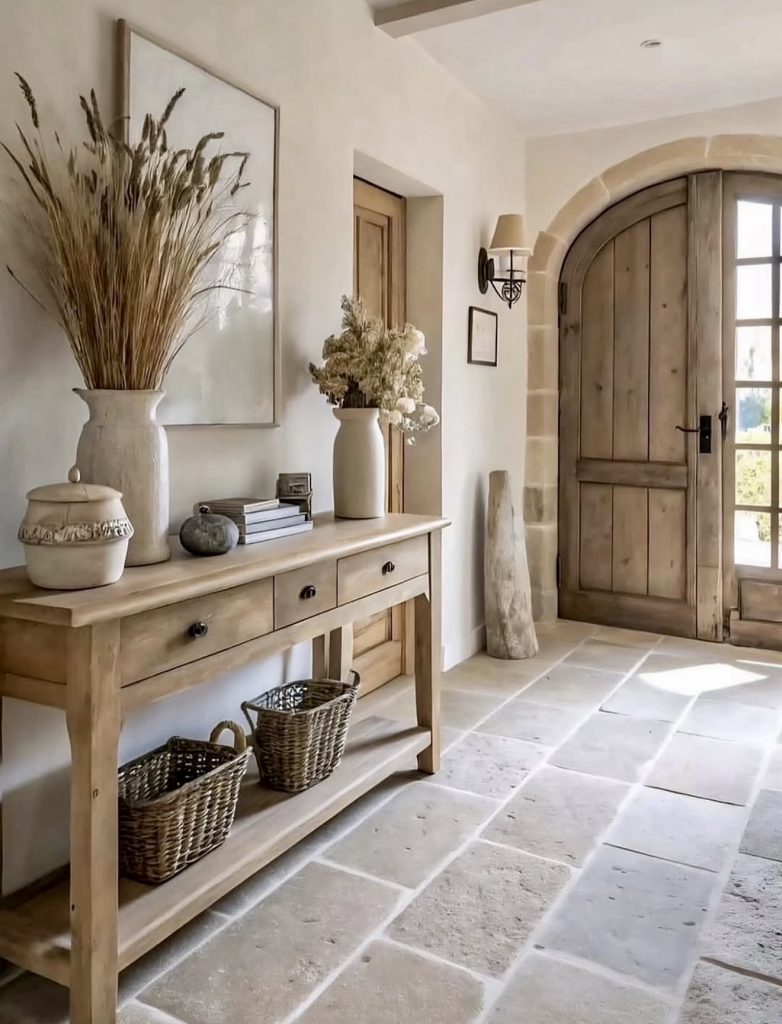 This entryway perfectly captures French country style—simple, rustic, and effortlessly elegant. Weathered wood, limestone flooring, and hand-thrown pottery infuse the space with authentic antique warmth. A bouquet of dried florals in a tall vase gives it that touch of bohemian charm, while the curved doorway softens the structure, balancing masculine and feminine energy. It’s the kind of entry that feels like a gentle welcome, where every material tells a story of age, artistry, and understated beauty.