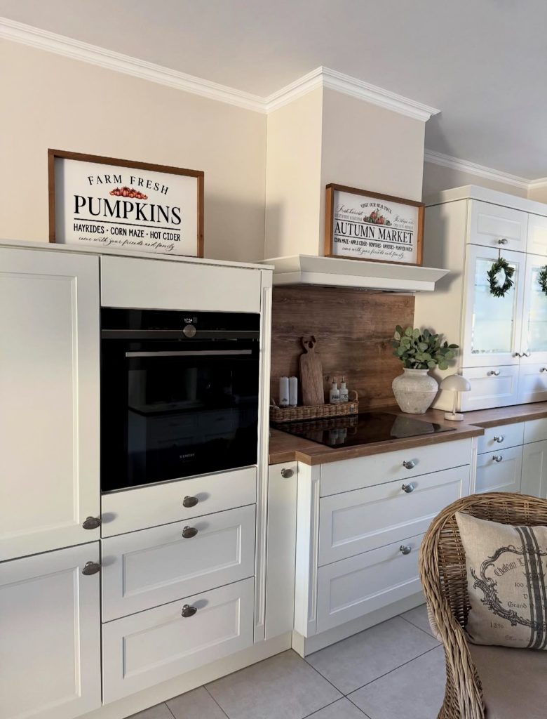 This kitchen radiates country coziness with a seasonal twist. Vintage signage celebrating pumpkins and the Autumn Market gives the space a nostalgic, Western farmhouse feel. White shaker cabinets and warm wooden countertops maintain the rustic backbone of the room, while woven seating introduces a boho element. For 2026, designers are celebrating small details like this—playful yet classy accents that reflect changing seasons and the homeowner’s personality. It’s DIY decor done right: personal, warm, and always welcoming.