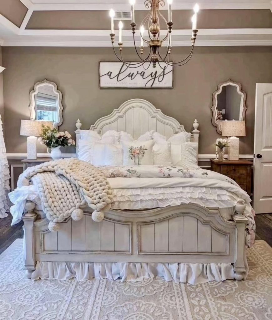 This dreamy bedroom is the definition of farmhouse luxury—all soft linens, vintage wood, and layered comfort. The antique bed frame with ruffled bedding and a chunky knit throw creates a space that’s equal parts French and country. Warm lighting from the chandelier and bedside lamps gives it a moody, intimate glow. In 2026, the most beloved farmhouse bedrooms are leaning into this blend of bohemian romance and classic structure—inviting, nostalgic, and full of quiet beauty.