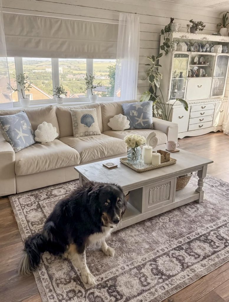 Bright and airy, this living space embodies coastal farmhouse living like no other. The room features pale neutral tones, draping white curtains, and shell-themed pillows decorated in various seashell blues and adds a gentle seaside drift that feels simultaneously modern and country. Fully restoring vintage charm, a white hutch and rustic coffee table complement the serene, boho style of the room perfectly, while the framed window draws the eye to a distanced panoramic view. All of this reminds us to embrace farmhouse decor in 2026 and let nature and light in. There are no worries about connecting the room to the surroundings. Texture and boho interior tones are more than enough.