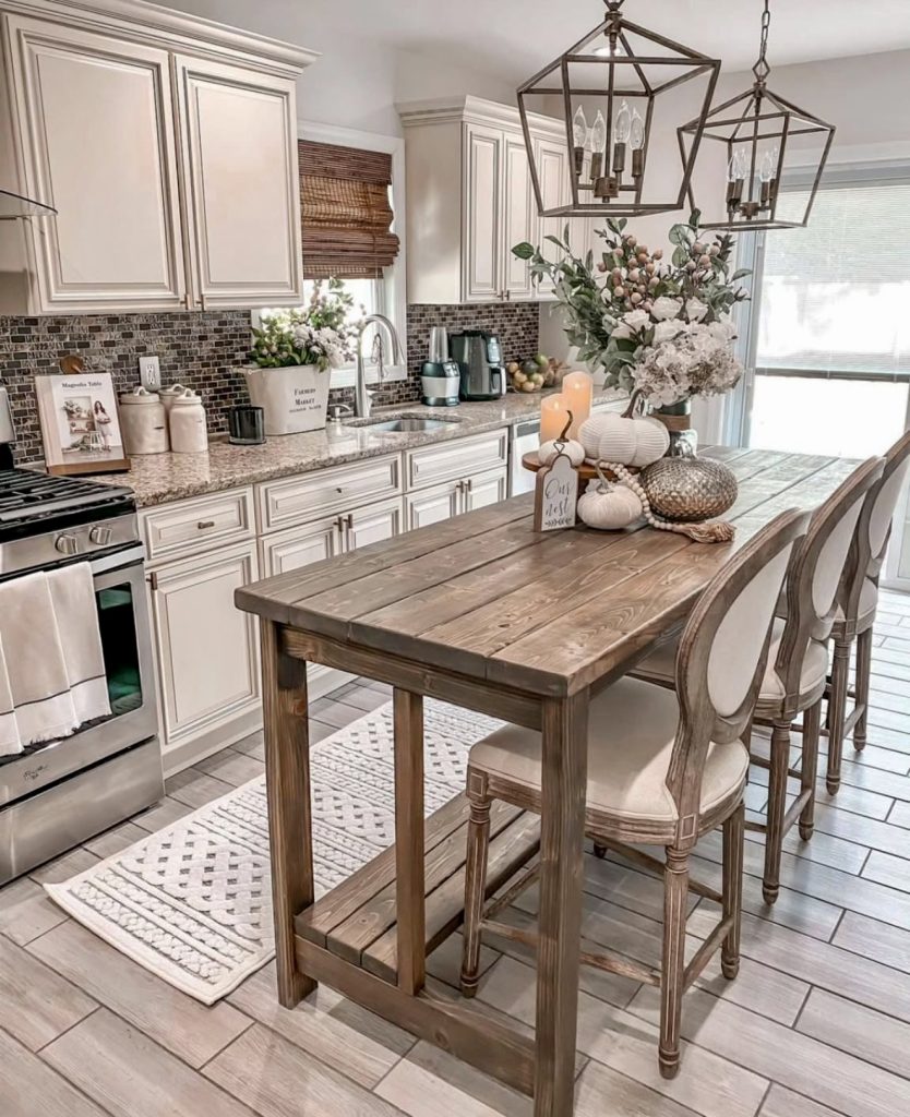 This kitchen sits perfectly at the intersection of modern comfort and rustic sophistication. A weathered wood top on the island paired with cream cabinetry, iron pendants, and a soft western ambiance creates the perfect atmosphere. Ideal for right before Christmas and the transition from the seasonal decor to decorative pumpkins and florals. This look defines the 2026 trend that centers around classy, cozy kitchens. Furthermore, DIY decor meets everyday function: It’s about slow mornings, warm coffee, and a space that feels genuinely lived in.