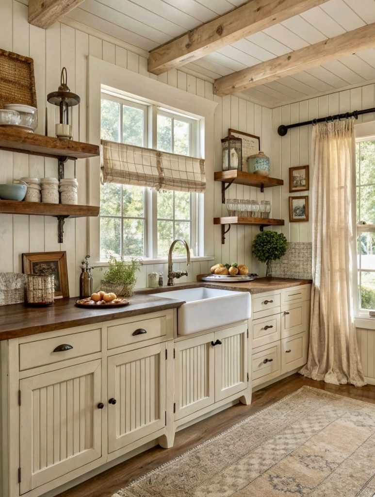 Paneled cabinetry, open shelves, and exposed beams—this is country living at its finest. Every element here feels authentic, from the farmhouse sink to the vintage-style jars and baskets. The light filtering through linen drapes adds a nostalgic glow reminiscent of primitive cottages and French country estates. The key to recreating this timeless atmosphere lies in honest materials: real wood, worn metals, and hand-thrown ceramics. It’s a simple, heartfelt approach that remains the soul of farmhouse decor in 2026.