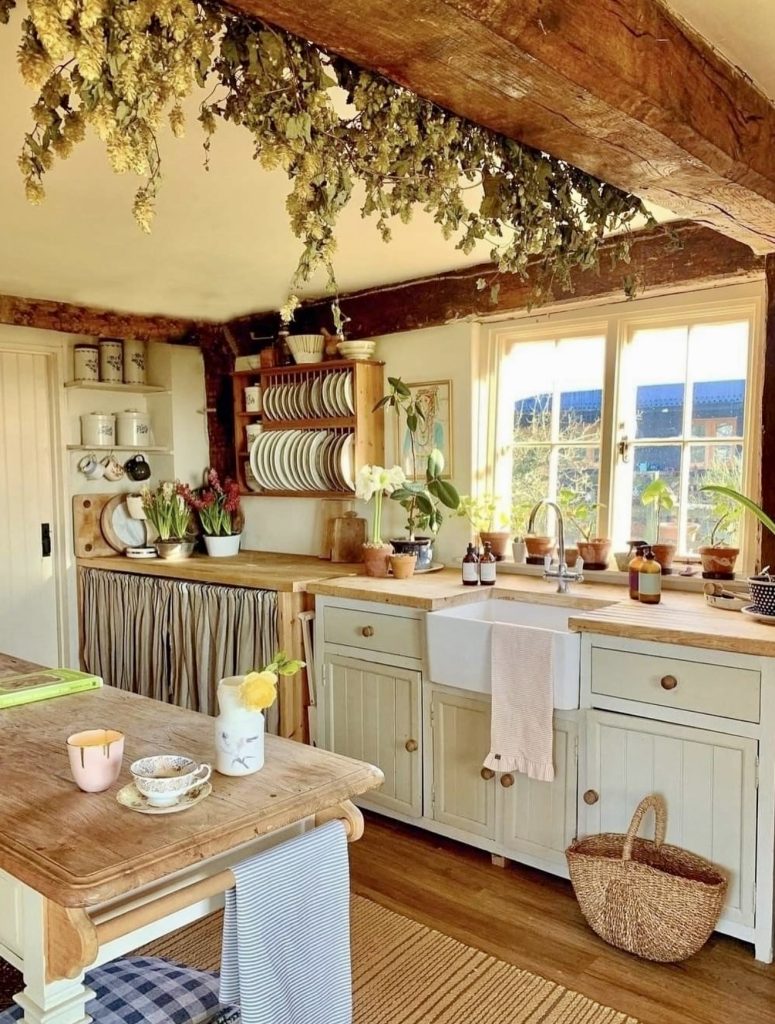 This room transports you straight into the pages of a cottage fairy tale. Hanging herbs, soft sunlight, and layered wood tones give this kitchen a charmingly bohemian and vintage vibe. The use of checkered textiles, handcrafted ceramics, and a sturdy farmhouse table makes it deeply personal and wonderfully eclectic. As the farmhouse trend evolves, this romantic, slightly imperfect English country style remains a major influence—proving that beauty often lives in the lovingly mismatched details.