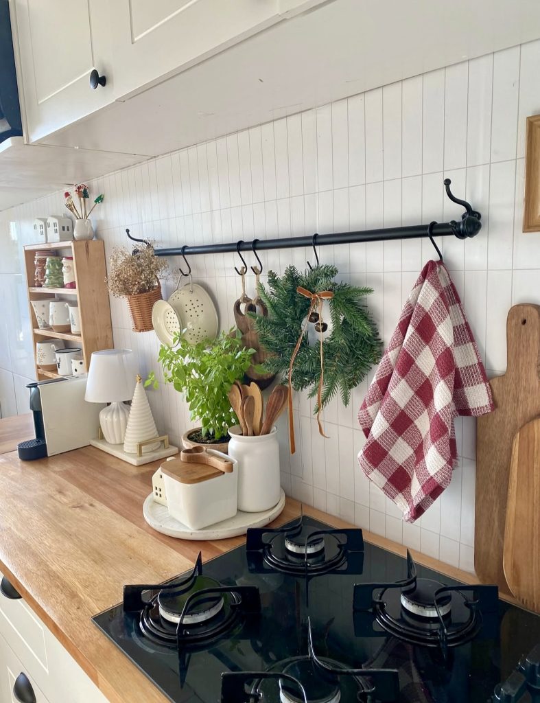 Here’s where DIY creativity meets Christmas warmth. A simple garland of greenery, checkered towel, and wooden accents turn this everyday kitchen into a cheerful holiday scene. The modern stovetop contrasts with the rustic wood countertop, blending practicality with charm. It’s a space that feels alive—homey, aromatic, and filled with small, thoughtful touches. This is farmhouse decor 2026 at its best: classy, joyful, and rooted in genuine comfort that welcomes everyone who steps inside.