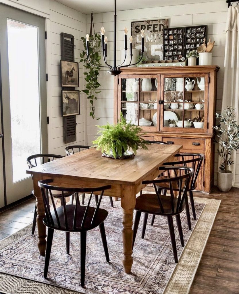 This dining space blends vintage personality with country authenticity. The natural wood table, paired with black spindle chairs, grounds the room in primitive charm, while the distressed hutch and shiplap walls add texture and soul. The greenery centerpiece introduces a touch of boho freshness, balancing the rustic backdrop. Decorative signs and antique accents bring that slightly Western, slightly eclectic character that defines 2026’s approach to farmhouse interiors—personal, layered, and full of history.