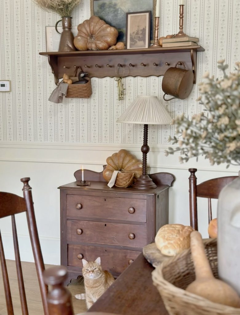 This intimate corner radiates primitive farmhouse nostalgia. Warm wood furniture, antique copper, and autumnal gourds set a moody, storybook tone. The wallpaper pattern whispers vintage tradition, while the cat lounging nearby adds a cozy, lived-in feel. In 2026, decorators are rediscovering this simple yet rich aesthetic—spaces that celebrate patina, memory, and the imperfect beauty of age. This look feels distinctly country, but it’s elevated through timeless materials and careful, soulful curation.