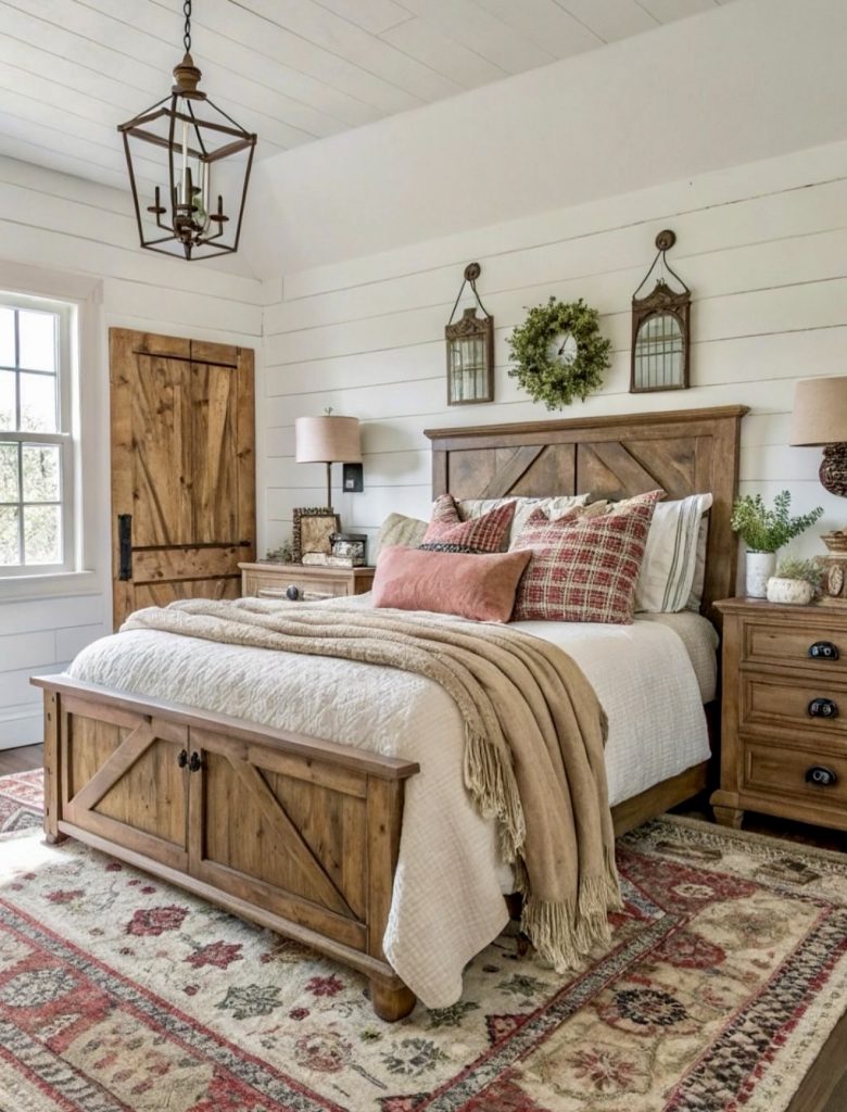 A harmonious mix of Western strength and French country softness defines this stunning bedroom. Reclaimed wood furniture, plaid accents, and layered linens create a sense of warmth that’s both rustic and classy. The shiplap walls and barn-style door anchor the room in classic country tradition, while the floral rug adds an eclectic, almost bohemian note. This space captures the new 2026 farmhouse ideal—where heritage meets comfort, and tradition feels refreshingly personal.