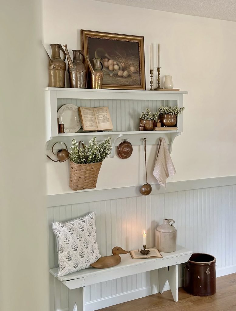 This small nook embodies the poetry of farmhouse decor—a mix of antique collectibles, French influence, and soft neutral tones. The open shelving displays copper jugs, florals, and old books that tell stories of craftsmanship and care. A single lit candle adds moody intimacy, while the wainscoting and bench make it functional and homey. It’s both DIY-friendly and classy, a gentle reminder that beauty often lives in the smallest corners of a home.