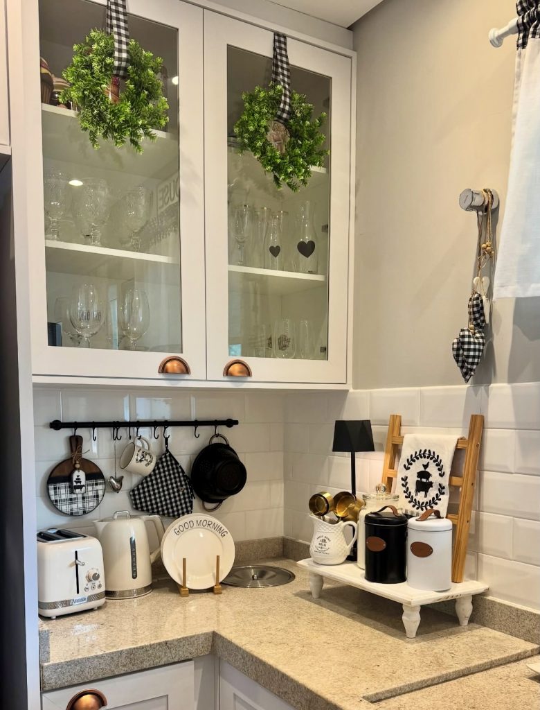 This charming nook captures the playful spirit of farmhouse decor 2026 with its black-and-white gingham accents and bright country personality. The glass cabinets, adorned with mini wreaths, bring a subtle Christmas touch that feels both timeless and cheerful. Modern countertop styling meets vintage flair through enamel mugs, labeled canisters, and open shelving. It’s a small but impactful space, reminding us that even the tiniest corners can carry big doses of boho charm and DIY creativity when styled with heart.