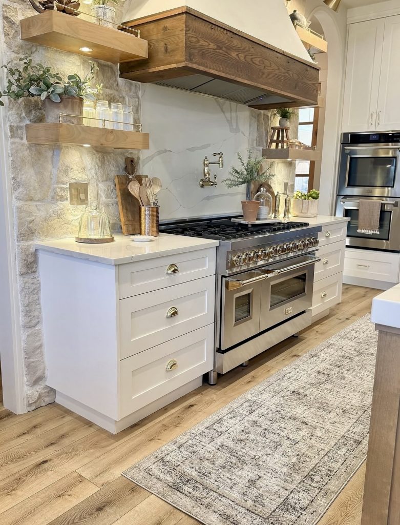 This kitchen perfectly blends rustic architecture with modern luxury. The exposed stone wall and floating wood shelves introduce organic texture, while brass hardware and a professional-grade oven elevate the look into something truly classy. It’s a strong nod to French country kitchens where raw materials meet refined finishes. For 2026, this balance between primitive authenticity and contemporary sophistication defines the next wave of farmhouse design—relaxed yet undeniably elegant.