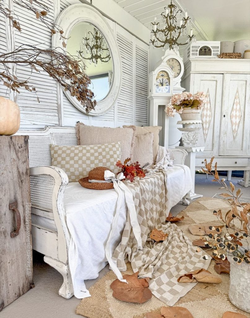 Soft neutrals, distressed wood, and checkered textiles make this space a bohemian dream. The layered linens, dried leaves, and antique clock all whisper of a gentler time—a scene that perfectly captures vintage farmhouse charm. There’s a hint of French influence here too, in the ornate details and muted palette. Whether styled for autumn or all year long, this look celebrates eclectic, simple living—proof that the beauty of farmhouse decor in 2026 lies in textures, layers, and the poetry of imperfection.