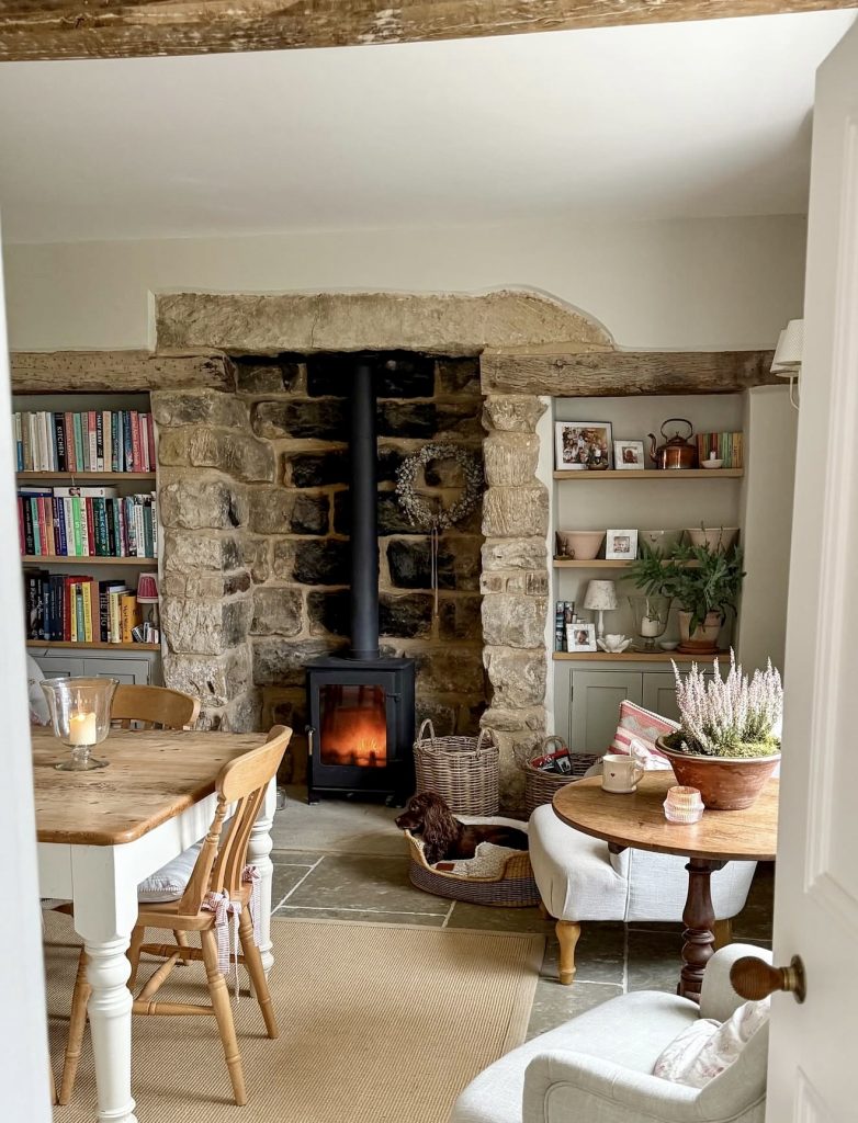This cozy room feels like a love letter to the English country home—a mix of stone, books, and soft light from a crackling wood stove. The primitive walls and exposed beams add Western sturdiness, while the textiles and worn wood bring boho charm. A dog curled up by the fire completes the story of true country comfort. In 2026, we’re seeing more homeowners embrace this look—combining old-world materials with modern practicality for spaces that feel grounded, nostalgic, and deeply human.