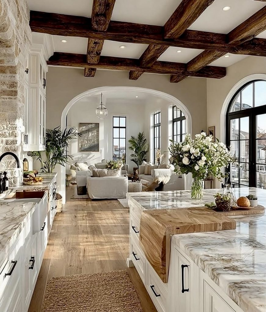 Few designs capture the heart of farmhouse decor like this open-concept kitchen and living space. Exposed wood beams draw the eye upward, while stone textures and dark metal details introduce a Western edge. The veined marble counters and wood butcher block island embody a seamless mix of rustic and classy. Floral arrangements, layered textiles, and plenty of natural light create an atmosphere of straightforward sophistication. This space reflects the 2026 trend toward eclectic farmhouse interiors—rooms that are equal parts vintage soul and modern comfort.