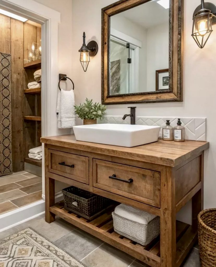 This bathroom captures a perfect balance of industrial and rustic farmhouse style. The wood vanity, framed mirror, and black hardware evoke a Western strength, while soft lighting and greenery add warmth. The tile pattern feels both modern and timeless, giving the space a classy yet primitive character. It’s an ideal blueprint for those who want to bring farmhouse decor into unexpected places—proof that even a small bathroom can embody charm, craftsmanship, and personality.