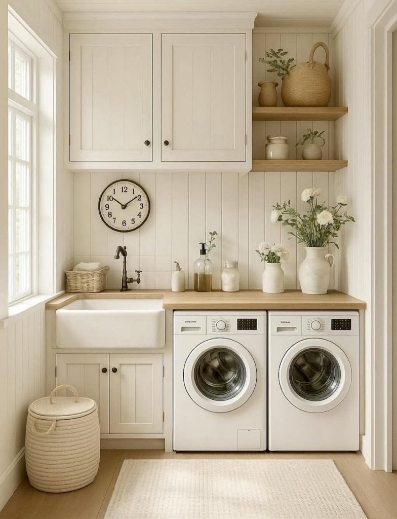 This serene laundry room celebrates the art of cottage minimalism. Cream cabinetry, light wood accents, and fresh blooms evoke a sense of calm that turns chores into a pleasure. The French influence shines through in its symmetry and elegance, while woven textures nod to the country lifestyle. In 2026, we’re seeing more homeowners invest in beauty even in the most functional spaces, embracing simple, bohemian, and DIY touches—from open shelving to decorative jars. It’s proof that farmhouse decor thrives on thoughtfulness and warmth, no matter the room size.