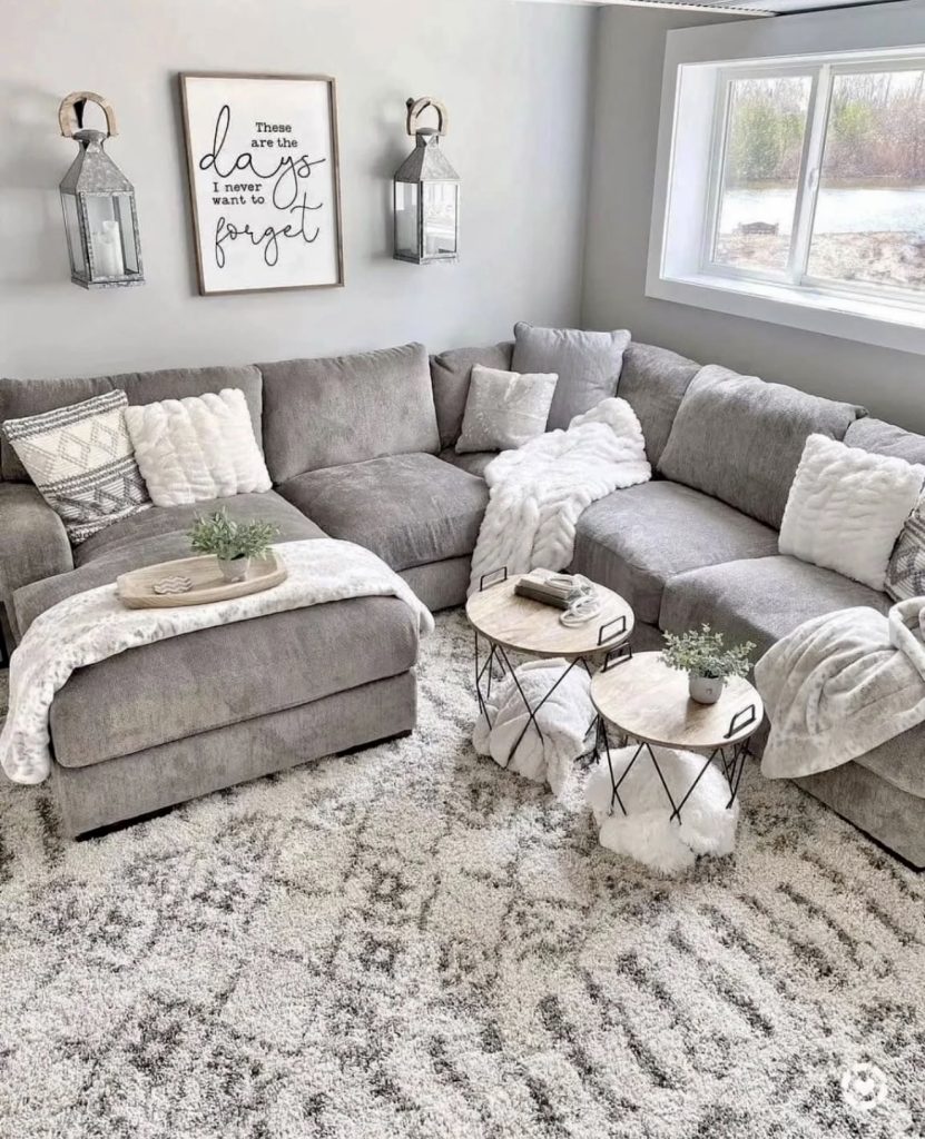 This plush gray sectional captures the modern comfort that defines farmhouse decor in 2026. Layered textures—from faux fur throws to tufted pillows—make the space feel irresistibly soft and inviting. The neutral palette keeps things simple, while the lantern sconces and cursive wall art add a charming country touch. It’s a perfect example of how to blend contemporary coziness with rustic soul. To elevate this style, mix materials: soft fabrics, metal accents, and weathered wood—a trio that never fails to create balance and warmth.