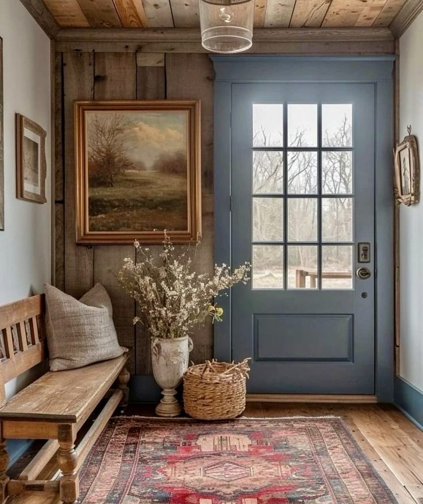Here, vintage meets country in the most heartwarming way. The wooden bench, distressed wall paneling, and antique landscape art tell a story of nostalgia and craftsmanship. The dusty blue door brings a hint of French country romance, while the rustic rug grounds the space with earthy red tones. This kind of entryway sets the tone for a home that feels both personal and poetic—where every piece has a history. For 2026, decorators are leaning toward eclectic storytelling—blending primitive finds with refined elements for a uniquely soulful look.