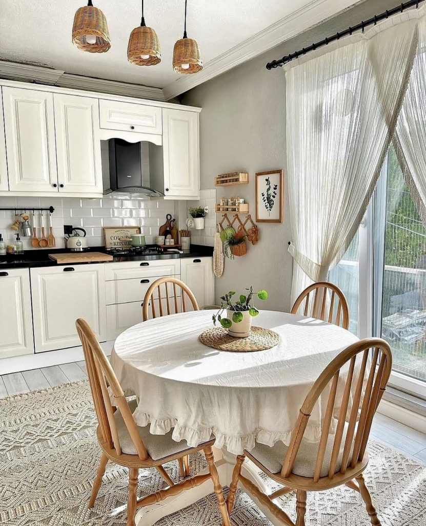 Sunlight pours through sheer curtains, giving this cottage kitchen an effortlessly bohemian charm. The white cabinetry, woven pendant lights, and ruffled tablecloth add just the right dose of sweetness without feeling dated. Touches of greenery bring freshness, while natural textures give it that signature farmhouse ease. This is where the DIY spirit thrives—a space that feels achievable, lived-in, and full of personality. For a modern twist, homeowners are mixing traditional white with matte black fixtures or subtle pops of wood to keep the look grounded and timeless.