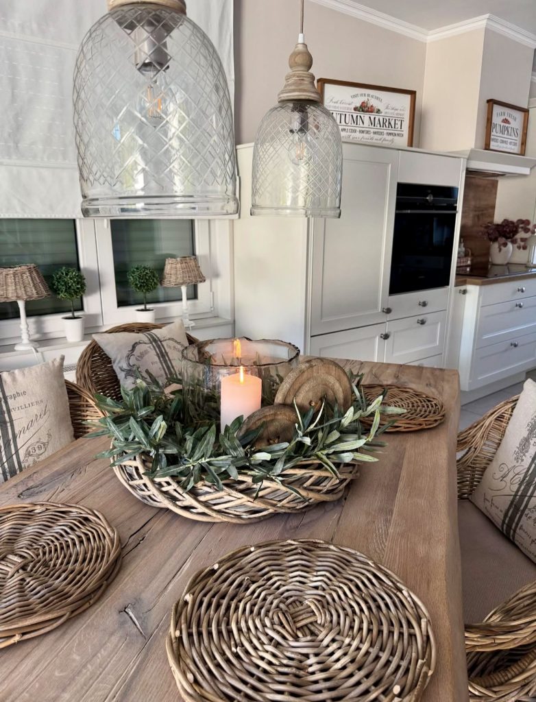 Wicker placemats, glass pendant lighting, and a centerpiece of olive leaves—this dining area channels a perfectly French country atmosphere. The woven accents bring a coastal ease, while the candle centerpiece lends a cozy Christmas glow that could work year-round. Every element, from the reclaimed wood table to the linen cushions, captures that refined yet rustic feeling that defines farmhouse decor today. For 2026, designers are highlighting tactile materials and classy neutral palettes—interiors that soothe rather than shout.