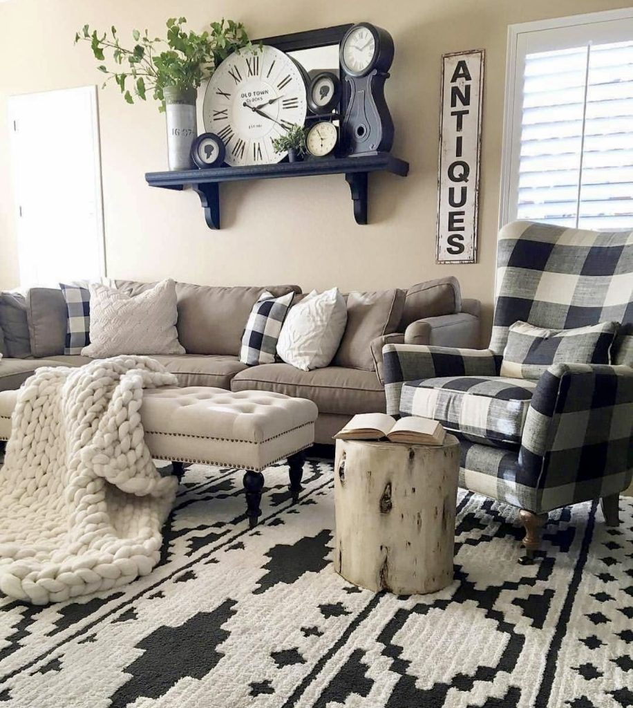 This black and white design feels bold yet familiar, mixing modern patterns with Western character. The gray couch and tufted ottoman are softened by a thick, knitted throw, while the checkered armchair brings country charm. Above, a shelf filled with oversized clocks and greenery doubles as wall decor, creating a playful focal point. The mix of textures — from the woven rug to the smooth wood stool — makes the space feel layered and intentional. This living room captures the essence of modern rustic styling: timeless, comfortable, and full of personality.