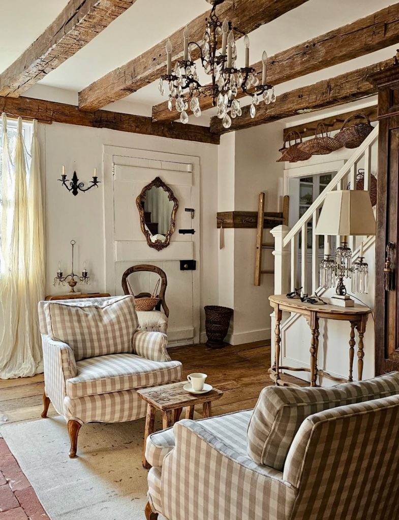 This country living room is full of vintage charm, highlighted by exposed wooden beams, antique mirrors, and crystal chandeliers. The checkered armchairs paired with rustic wooden floors bring a nostalgic, European farmhouse aesthetic. Subtle décor pieces like wall sconces and woven baskets enhance the cozy, timeless atmosphere.