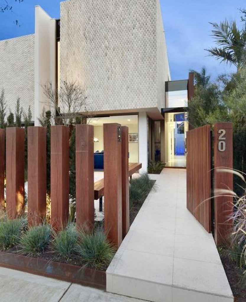 Vertical timber slats bring a sleek, Scandinavian-inspired feel to residential fencing, especially when paired with minimalist landscaping that enhances the natural warmth of the wood. This style works beautifully in the front yard, offering a sense of privacy without appearing closed off, and is a wonderful option for homeowners searching for something refined yet approachable. Because these slim boards create such a clean rhythm, the design complements both cottage-style homes and modern builds and can even be adapted as a DIY project for those comfortable working with wooden materials. It’s a smart visual upgrade that instantly boosts curb appeal for front-of-house settings while maintaining practicality for dogs or garden edging.
