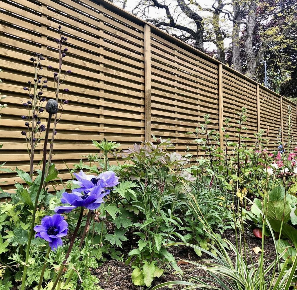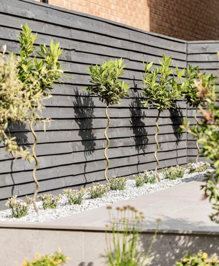 A simple horizontal plank fence with a deep charcoal stain becomes a sophisticated backdrop for gardens with sculptural plants and colorful foliage. Darker colors, especially in the UK, are trending in 2026, bringing out the best in homeowners who appreciate the contrast rich colors offer with brick buildings and lush greens. The horizontal design makes the fence and its wooden materials modern and warm. This fence is an excellent choice for privacy and compact patios. Paired with whimsical planting as shown by the spiraled shrubs here, the fence remains elegant while still providing a curated garden space. The design works especially well for anyone seeking to create a space that feels curated and stylish while still retaining organic charm.