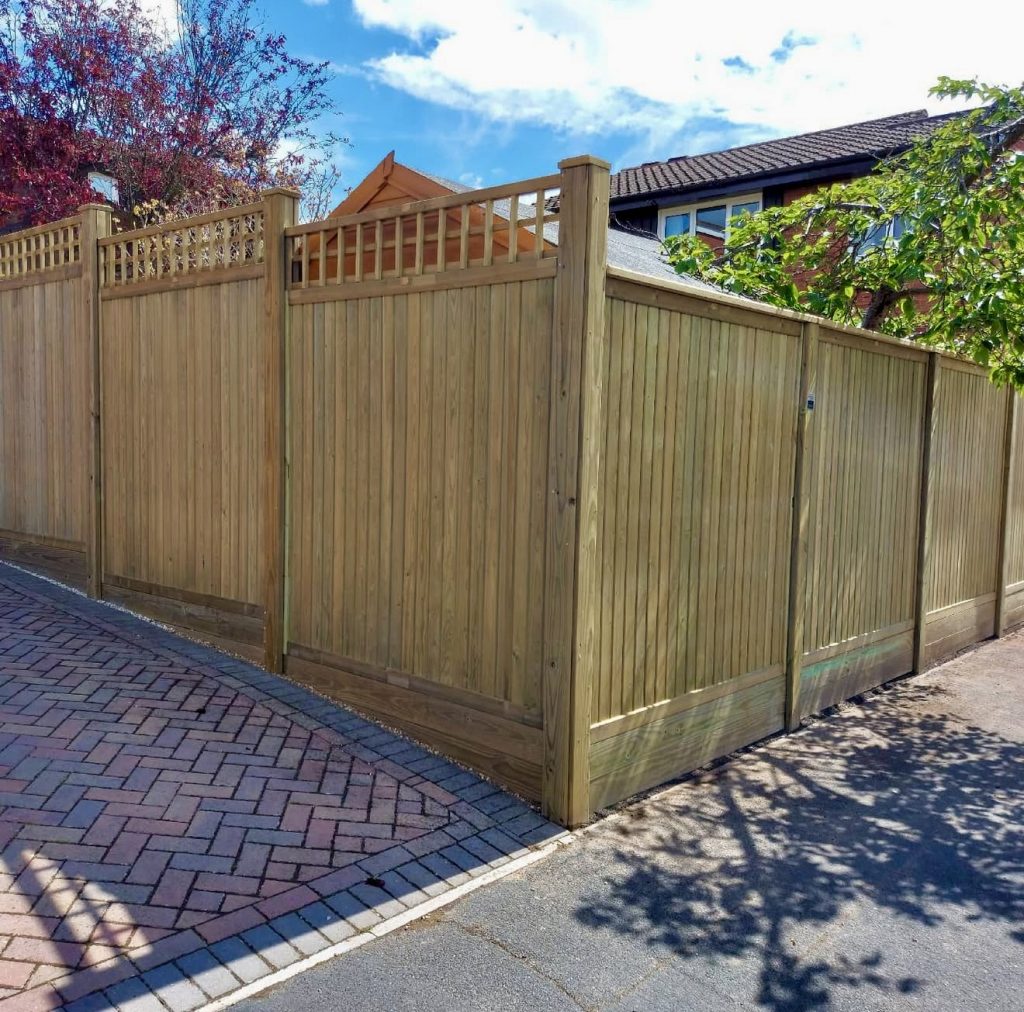 A classic tall timber installation with a decorative lattice top blends practicality with charm, giving homeowners a sturdy wooden privacy boundary while still allowing a touch of airflow near the upper edge. This structure works beautifully for gardens, especially in suburban neighborhoods where homes sit close together and a sense of separation is needed without feeling boxed in. The warm tone of the boards softens the hardscape, and the vertical lines help elongate the yard visually, making it a smart pick for corner lots or long driveways. It’s also a dependable choice for dogs and families who want a reliable fence that stays attractive over time, without drifting into the cheapest end of lumber options.