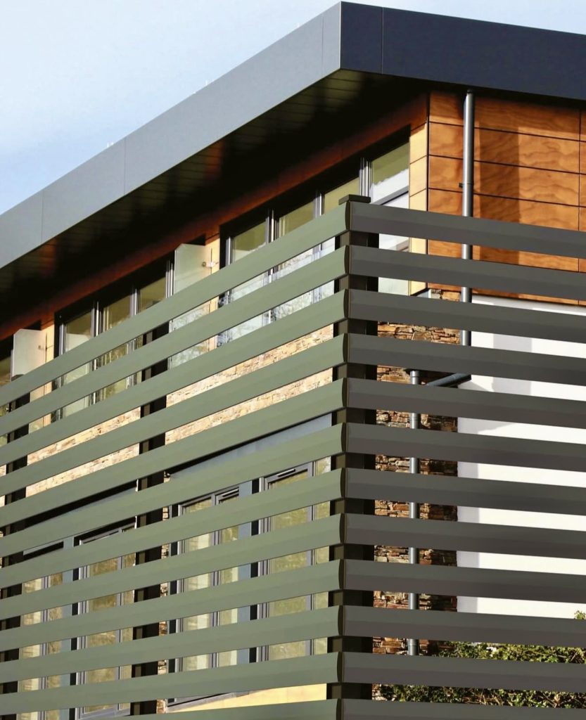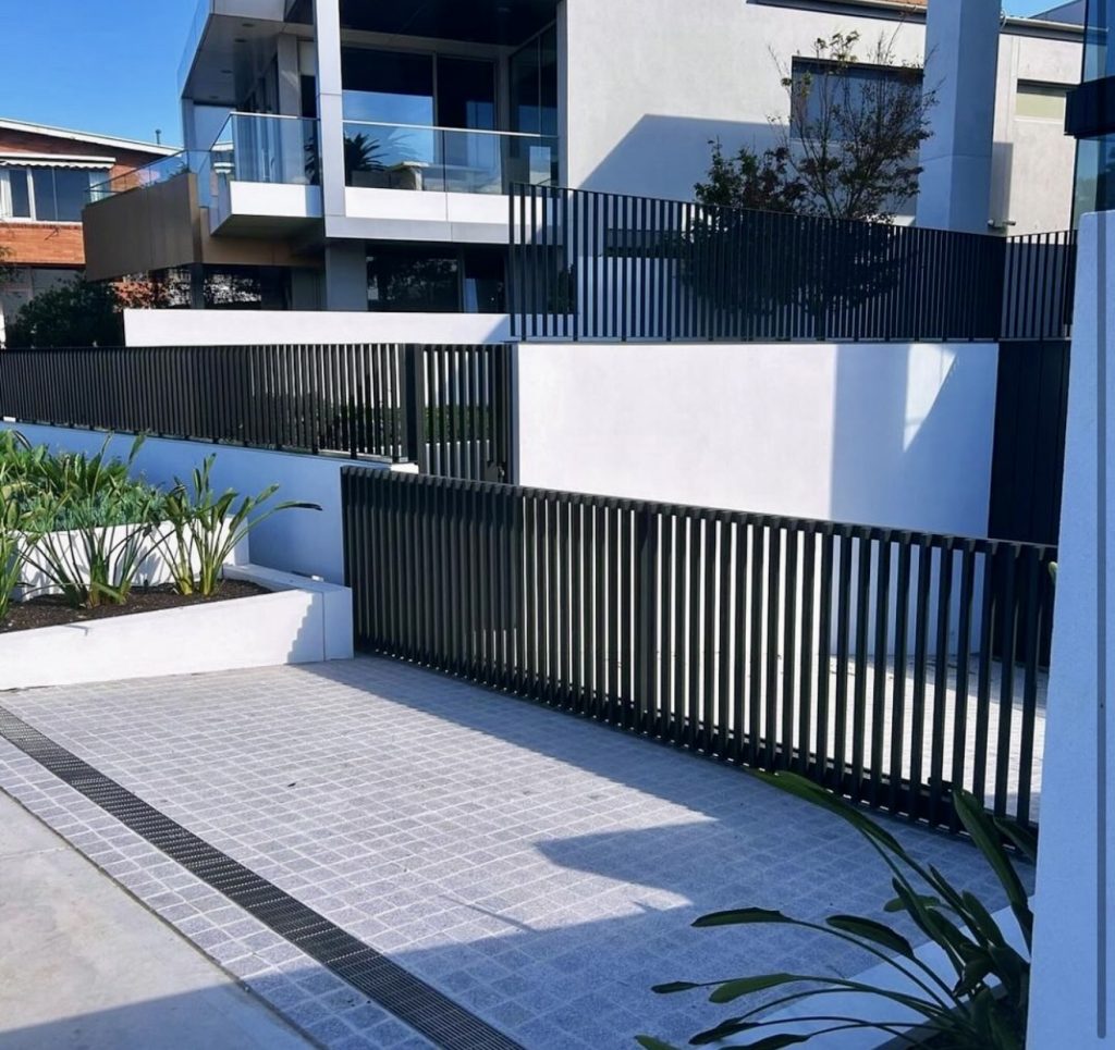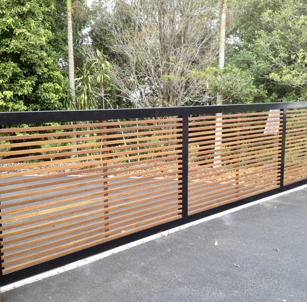 Bold horizontal metal slats create an eye-catching architectural screen that works beautifully in modern residential settings, especially where privacy is needed around balconies, terraces, or upper-level windows. This system adds striking linear texture without the maintenance of wooden materials, and its structured spacing provides partial shading while keeping sightlines open. It’s a popular choice in contemporary builds across the U.S. and Australia, where homeowners lean into materials that are both stylish and resilient. The sleek geometry makes the fence feel more like a design feature than a boundary, adding dynamic character to any outdoor space.
