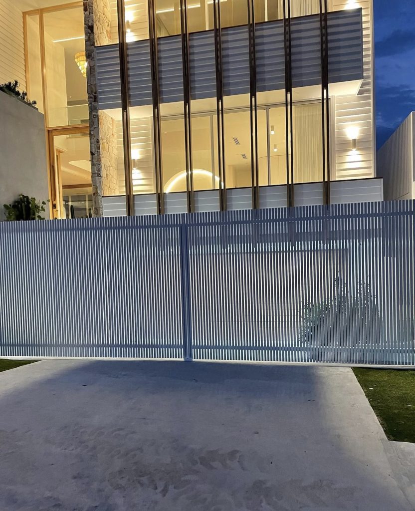 A tall vertical metal fence illuminated from behind brings a polished, almost sculptural quality to upscale properties—an elegant alternative to chain link or traditional metal styles. The slim vertical bars deliver excellent security for dogs, a refined look for front-of-house settings, and a minimalistic profile that pairs perfectly with modern architecture. When lit at night, the fence becomes part of the home’s ambiance, making the surrounding yard and entryway feel more curated and atmospheric. It’s a premium choice for homeowners who want durability, clean lines, and a fencing system that enhances nighttime appeal just as much as daytime function.
