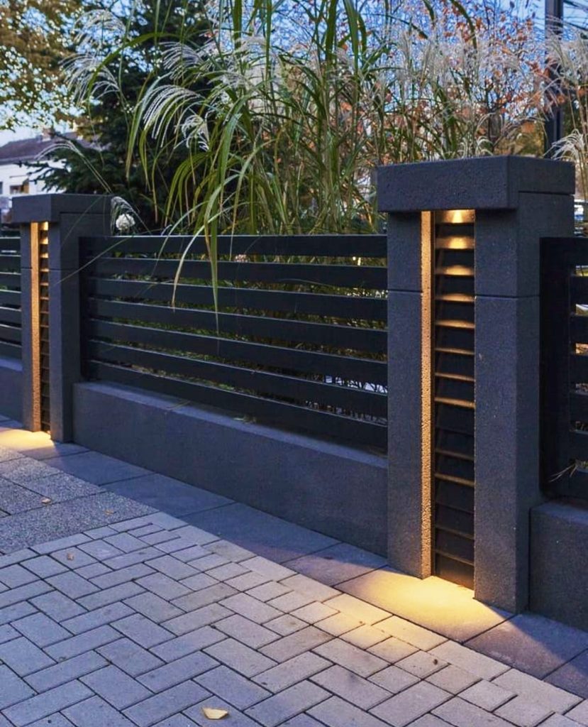 20. Sleek Vertical Metal Fence with Lighted Ambiance