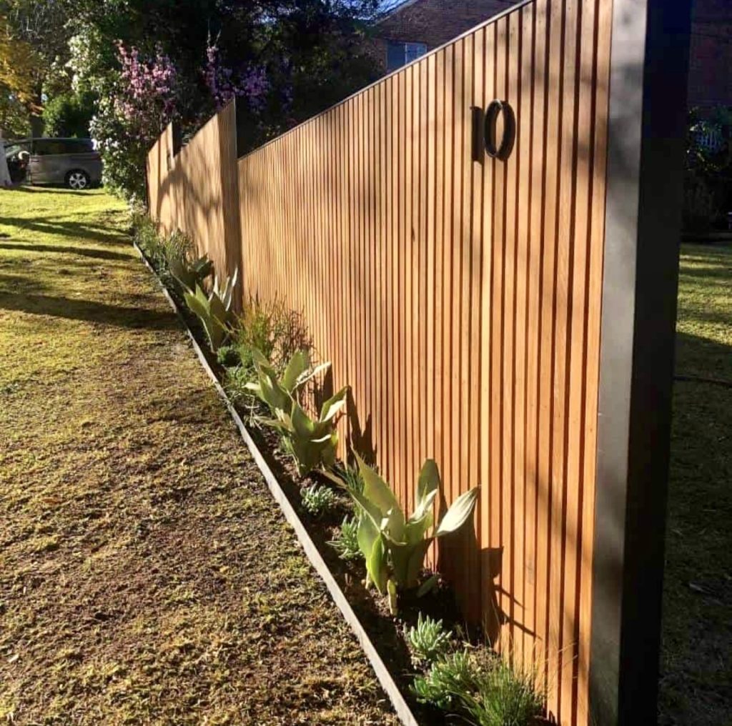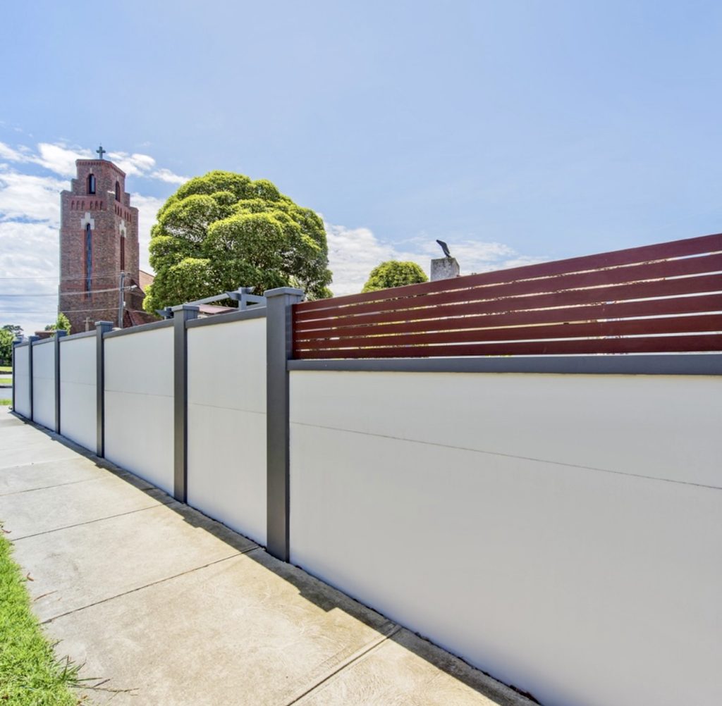 A solid composite or sheet metal panel fence topped with slats of warm timber creates a clean and durable boundary to busy suburban streets. The lower solid section of the fence provides reliable privacy, but the timber accent softens the overall appearance and allows the design to strike a balance between security and style. This approach works well for the front of a house in situations where noise reduction and visual separation are important, but the fence also must be welcoming rather than imposing. The mix of materials also appeals to those wanting a fence with long-term performance but still with some natural texture.
