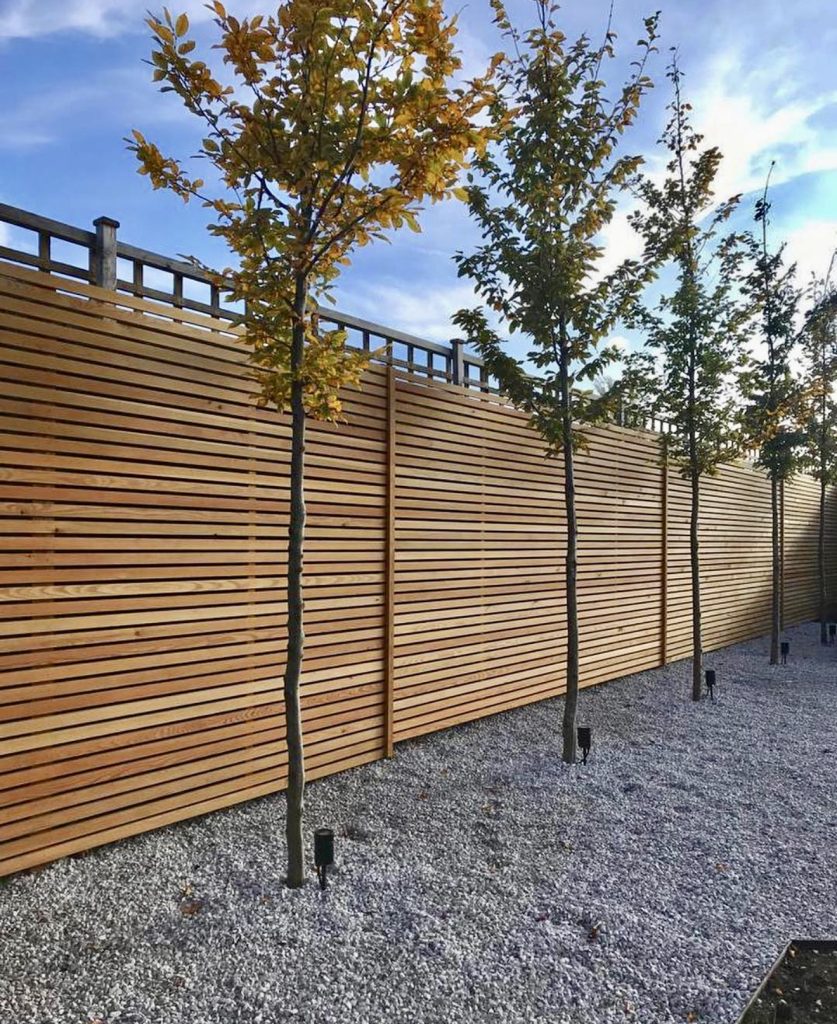 Wide-spaced slats of cedar add a luxurious quality to outdoor spaces, which makes them ideal for defining relaxing backyard areas or densely planted borders. The warm colors and horizontal lines create a calming atmosphere, and when combined with the flourishing nearby gardens, the design allows for an ideal amount of spacing to facilitate airflow. This design also offers practicality. The design is dog-friendly with an appropriate height and strong vertical structure and still manages to look polite and elevated. This design is loved and chosen by homeowners wanting a modern and also timeless look, especially in areas where wood can age and patinate gracefully with a light, silver tone.