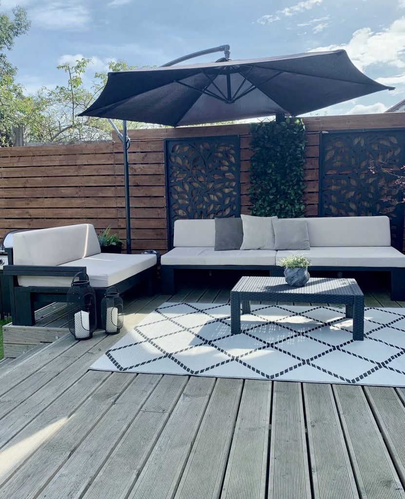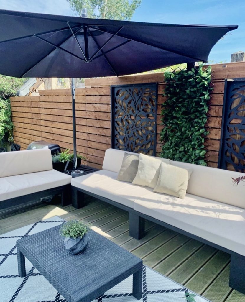 The design features quality wooden elements paired with intricate and ornamental metalwork for a sleek and stylish high-end design, ideal for a high-performance privacy screen for lounging and entertaining. The modern-design laser-cut panels serve as a privacy lattice, and the horizontal wooden slats work to maintain the warmth in a quiet outdoor space. The ideal pair for a homeowner who hosts guests often and wants a visually and architecturally balanced private retreat. This design feature certainly adds a touch of boutique-hotel polish to an everyday backyard deck.