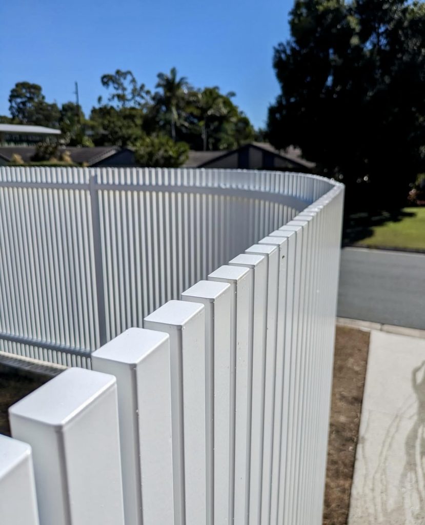 A curved run of white metal slats creates a bright, sculptural boundary that feels both minimalist and thoroughly modern—perfect for front-of-house placement, contemporary neighborhoods, or warm-weather regions like Australia and the U.S. South. The slim vertical bars mimic the rhythm of a refined picket design while offering the durability and crisp lines of metal, making this a strong low-maintenance choice for dogs and families wanting longevity without frequent upkeep. The fluid curve softens the structure, proving that even the most modern fences can deliver a gentle, design-forward presence in the landscape.