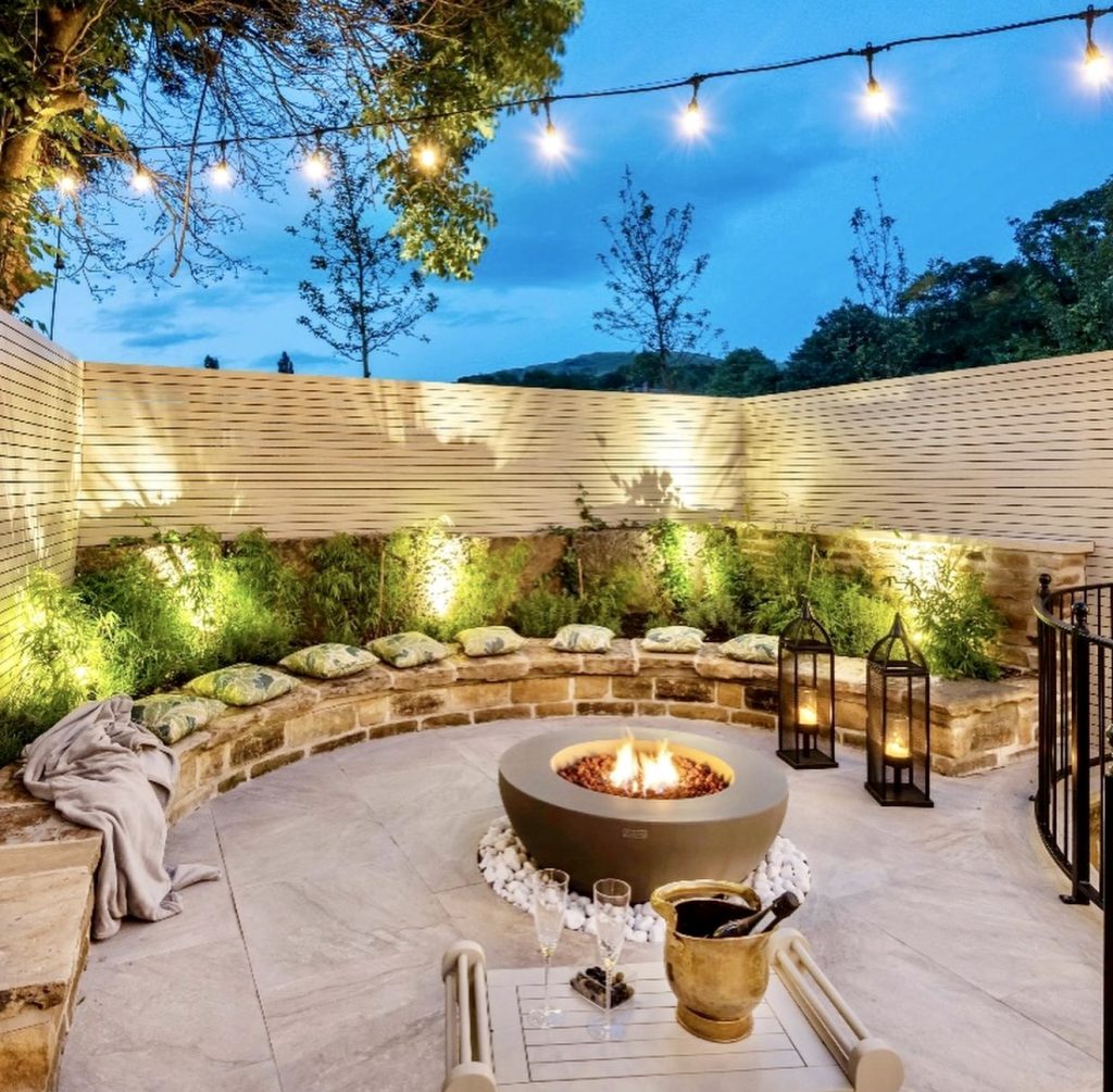 A curved privacy enclosure with layered horizontal lines creates a warm, intimate atmosphere—perfect for a firepit corner designed for gatherings and relaxed evenings. The soft wave-like pattern offers a more artistic alternative to standard wooden privacy fencing, all while providing meaningful separation for privacy in a cozy backyard retreat. Its height and shape also make it ideal for gardens, as the curved structure hugs the planted border and enhances the ambient light effects. This kind of design blends beautifully with stone seating and natural landscaping, making it an appealing choice for anyone hoping to create a boutique outdoor experience at home.