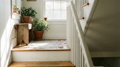 In a nod to industrial design, this staircase pairs black metal with warm wooden steps, creating a look that is both edgy and inviting. The metal railing adds an urban touch, while the minimalist aesthetic keeps the space feeling open and airy. It’s a perfect example of how modern design can integrate ideas of industrial simplicity with residential warmth.