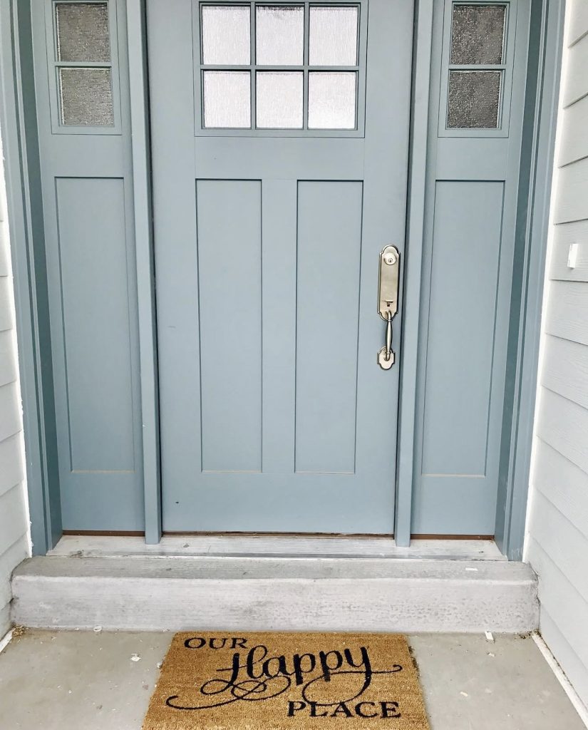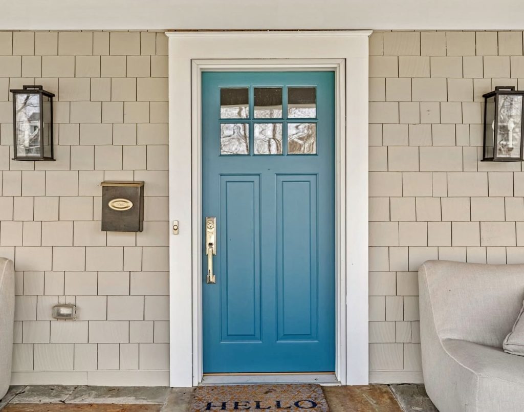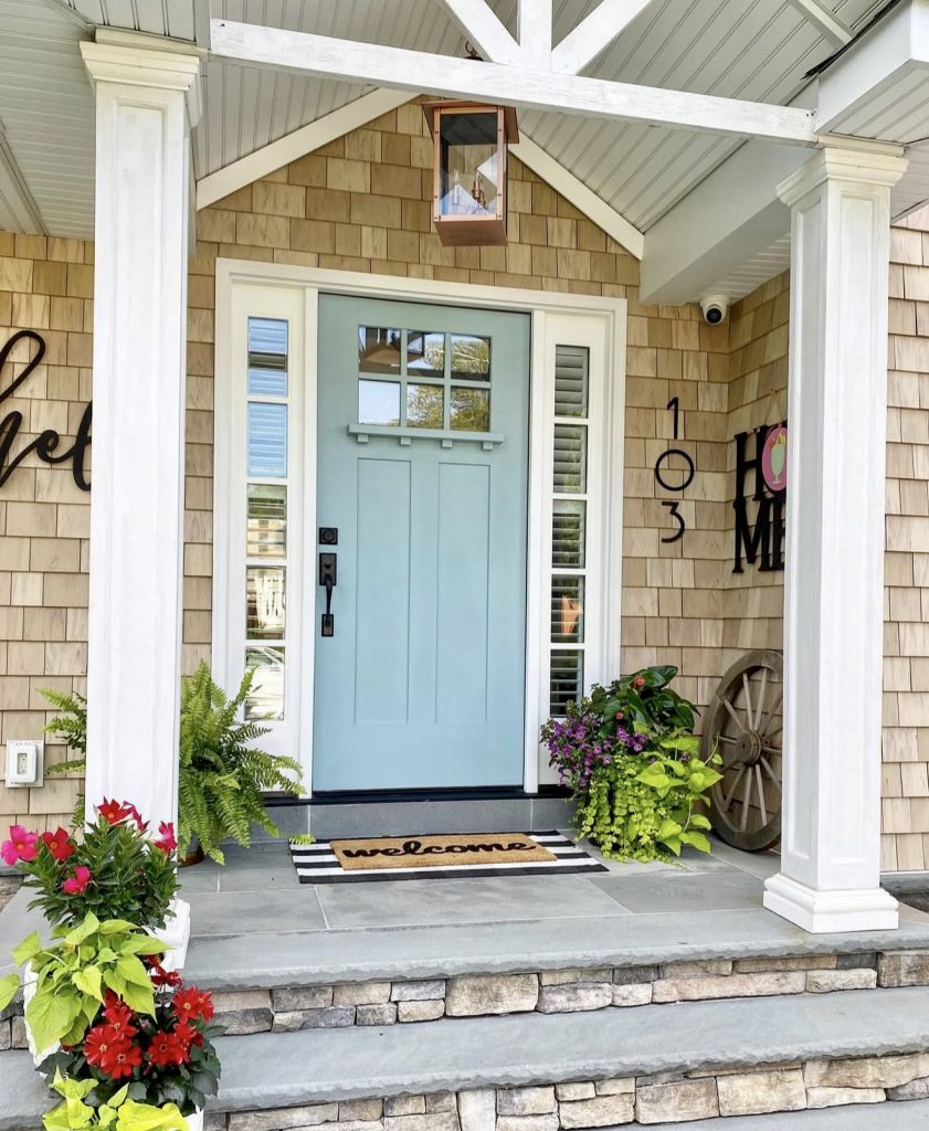 Soft blue continues to top the list for homeowners seeking the best front door color for 2026 if they desire something cool yet simple. This specific blue door looks outstanding on gray houses because it injects color in the right proportions to stand out without overdoing the theme. Since the door features simple glass grids on top of the clean panels, its true Craftsman architectural effect stays intact throughout the years. Adding the natural coir doormat simply brings the perfect casual feeling for the whole family in the U.S. who wants lifestyles in the warm sun. Experts recommend painting blue for people who want simple makeovers that increase curb appeal without any doubt in their minds.