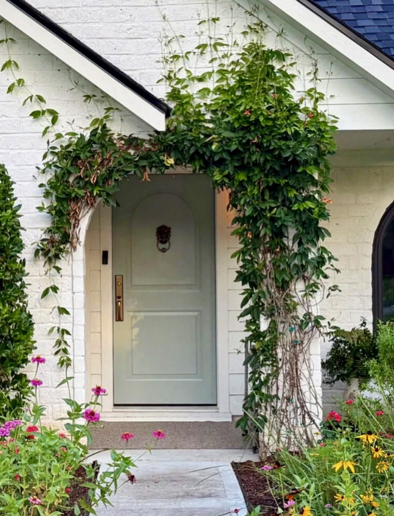 This soft green door color brings a delightful storybook aesthetic to the front of the white house whenever vines are clambering over the top and the garden is in bloom. Soft greens in the sage spectrum are one of the most dominant 2026 door color trends because they bring such an organic feeling that’s soothing and clearly in touch with the outdoors. This color won’t compete with the natural surrounding foliage because of its softening effect. This particular color choice works beautifully on houses reminiscent of the cottage aesthetic because it brings such natural beauty to the surrounding garden.