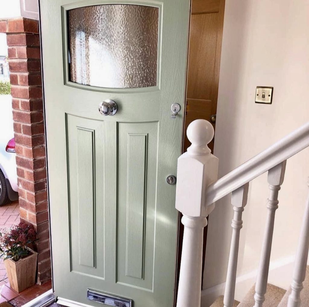 This beautiful sage green door is one of the best examples of how soft color schemes influence color trends in 2026. Adding the soft color of the sage green door to the warm color theme of the surrounding wood and bricks brings life to the whole place. Such color schemes instantly make every door look warm and personal. Experts also recommend the use of sage green for people who like something warmer than gray but want something cooler than the normal green color. It also looks good on houses made of either ‘’beige’-colored material or ‘’brown’-colored bricks.