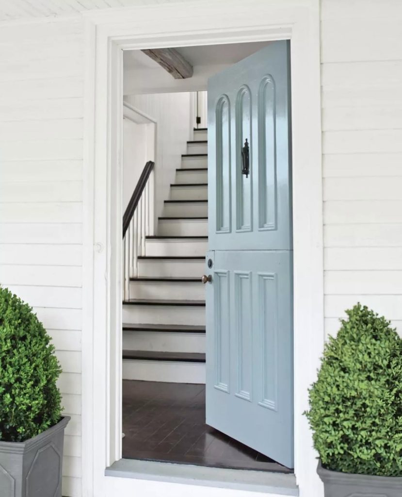 Such an entrance door in the color of the blue sky brings the feeling of freshness to the entrance of the dwelling. Such a blue color goes very well along with the color of the tan house. Such a blue color also brings the feeling of freshness to the house. There are many designers who recommend the choice of the blue color for the entrance door in 2026. Such a blue color also looks very attractive along with blue siding. Such a blue color also brings the feeling of freshness to the entrance door. Such a blue color also goes very well along with natural stone.