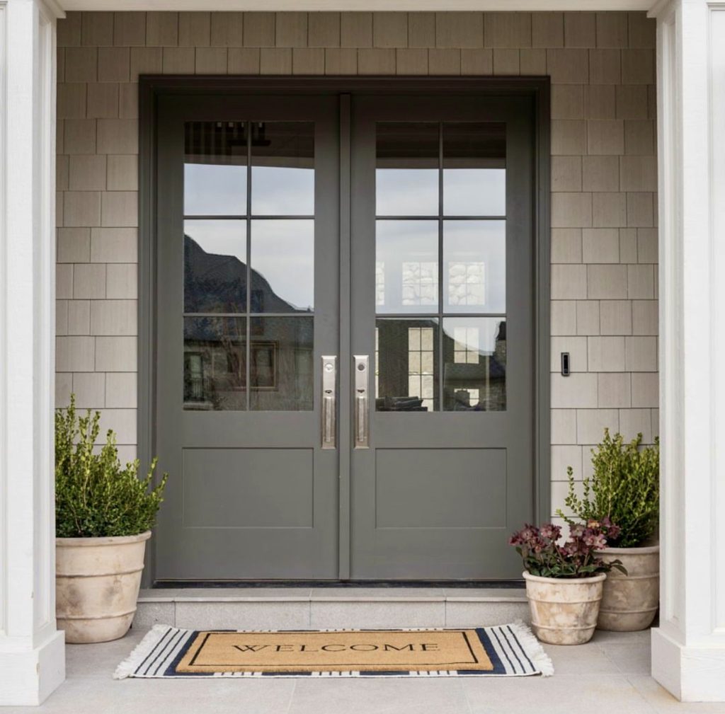 Deep charcoal double door options like the one in the image have also been common in the 2026 trends if the home’s house shingles are tan. However, the color works equally well on other house shingles. To some degree, the color is perfect for everyone who wants elegance in their homes. Its elegance does not require much effort to maintain. Additionally, the color works very well on both gray house siding and on houses made of different-colored house shingles. To some extent, the color complements the gray color very much. Thus, the color’s elegance is ideal for everyone.