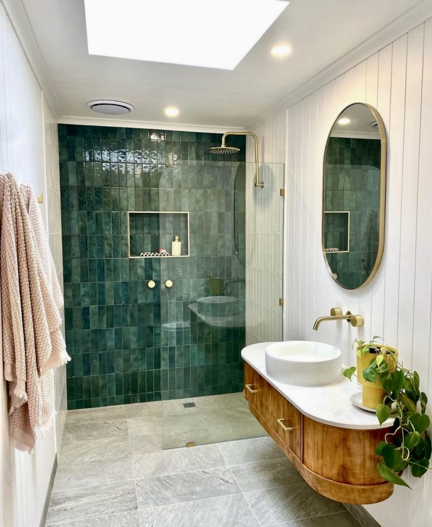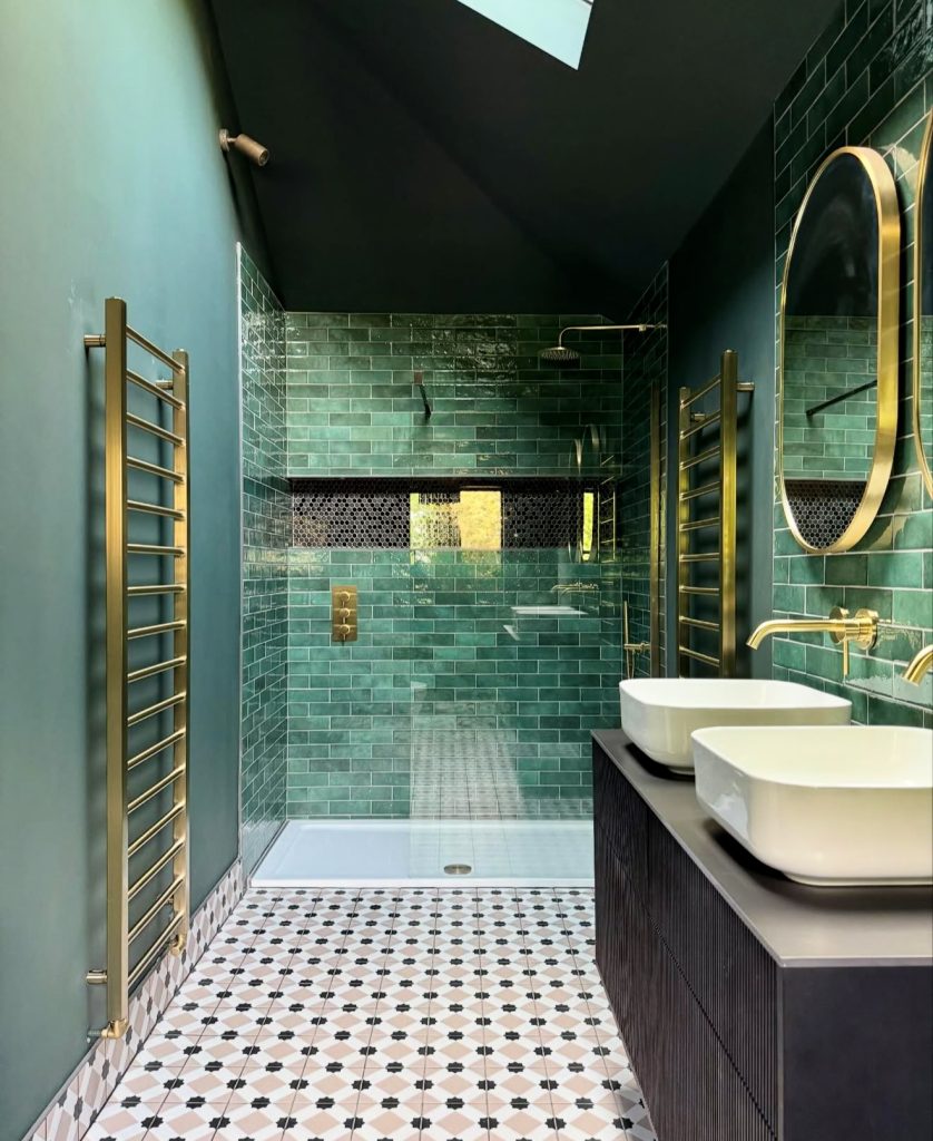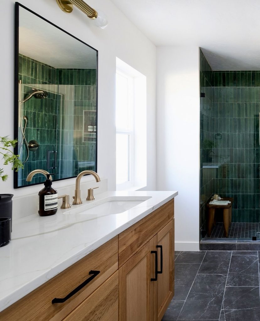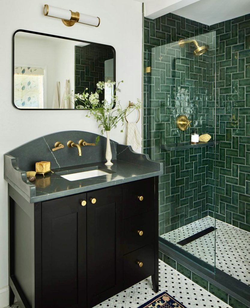 This emerald-tiled shower glows with rich texture, paired beautifully with brass accents that bring warmth and vintage refinement. The vanity’s black and gold combination grounds the design, adding a note of urban sophistication. A sculpted marble countertop introduces subtle luxury, while white walls open up the space, making it feel bright and balanced. Every element—from the modern mirror to the herringbone tiles—contributes to an atmosphere of understated glamour. It’s the kind of design that feels both contemporary and timeless, ideal for those who love a moody yet elegant aesthetic.