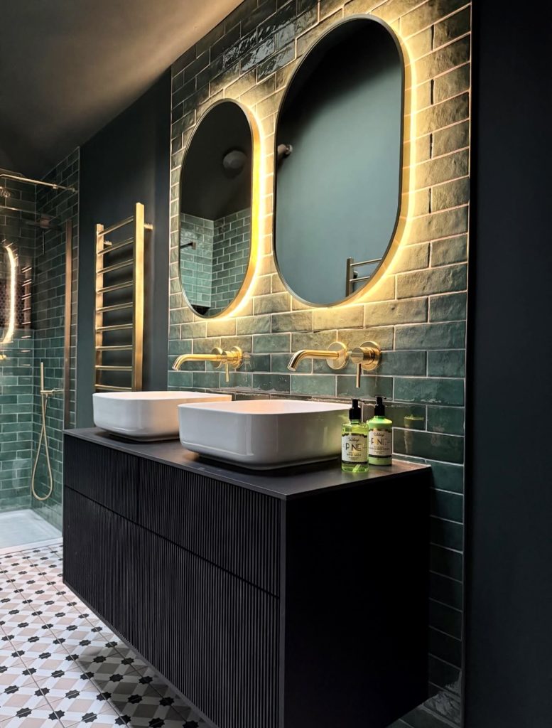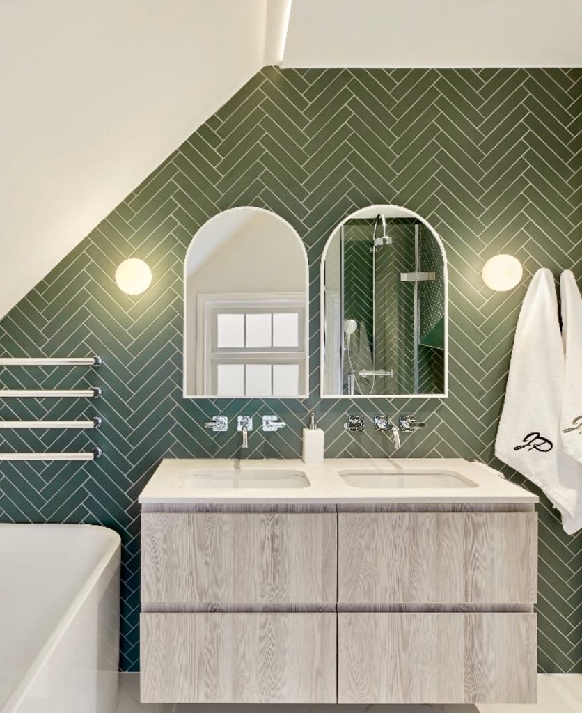 This bathroom turns forest green into a statement with herringbone walls that stretch to the ceiling in a seamless, architectural pattern. Pale wood cabinetry in beige and brown adds softness, balancing the bold tilework with Scandinavian calm. The rounded mirrors and double sinks highlight symmetry and elegance, offering a blend of practicality and artistry. Simple globe sconces and chrome fittings contribute to the clean, white, and green contrast that defines this modern retreat. It’s an example of how geometric layouts can make dark tones feel bright and dynamic.